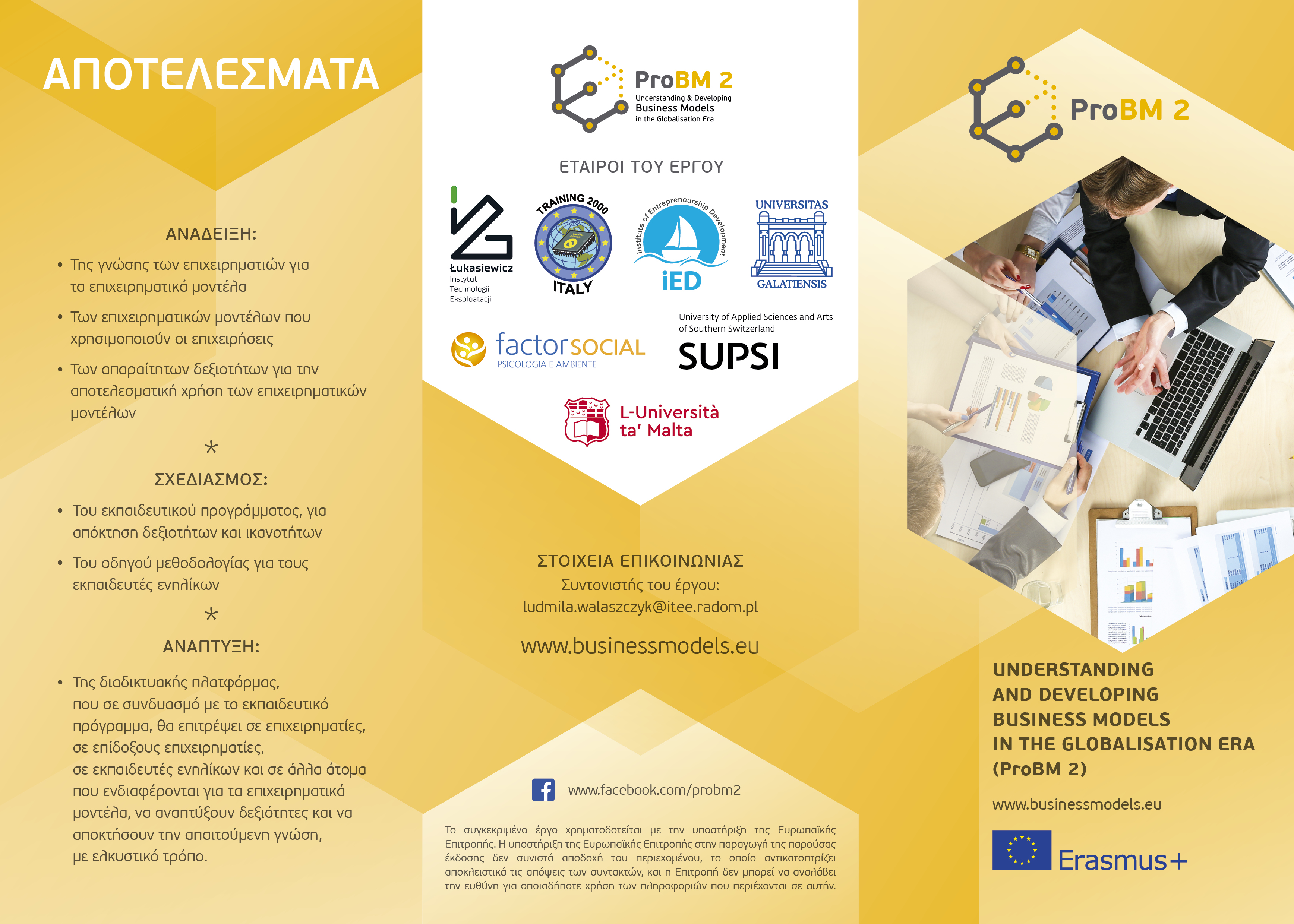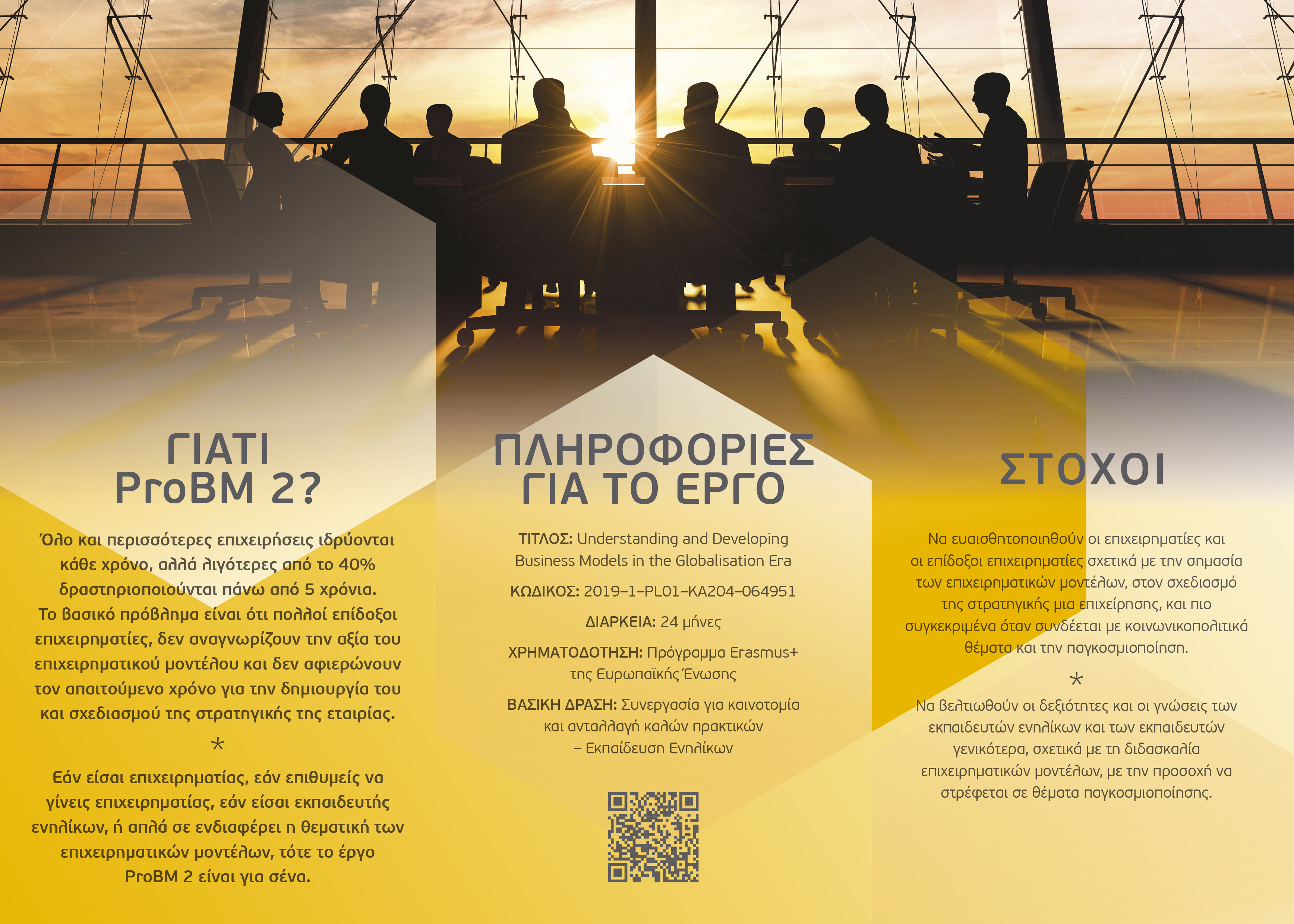 Όλο και περισσότερες επιχειρήσεις ιδρύονται κάθε χρόνο, αλλά λιγότερες από το 40% δραστηριοποιούνται πάνω από 5 χρόνια. Το βασικό πρόβλημα είναι ότι πολλοί επίδοξοι επιχειρηματίες, δεν αναγνωρίζουν την αξία του επιχειρηματικού μοντέλου και δεν αφιερώνουν τον απαιτούμενο χρόνο για την δημιουργία του και του σχεδιασμού της στρατηγικής της εταιρίας. Εάν είσαι επιχειρηματίας, εάν επιθυμείς να γίνεις επιχειρηματίας, εάν είσαι εκπαιδευτής ενηλίκων, ή απλά σε ενδιαφέρει η θεματική των επιχειρηματικών μοντέλων, τότε το έργο ProBM 2 είναι για σένα. |