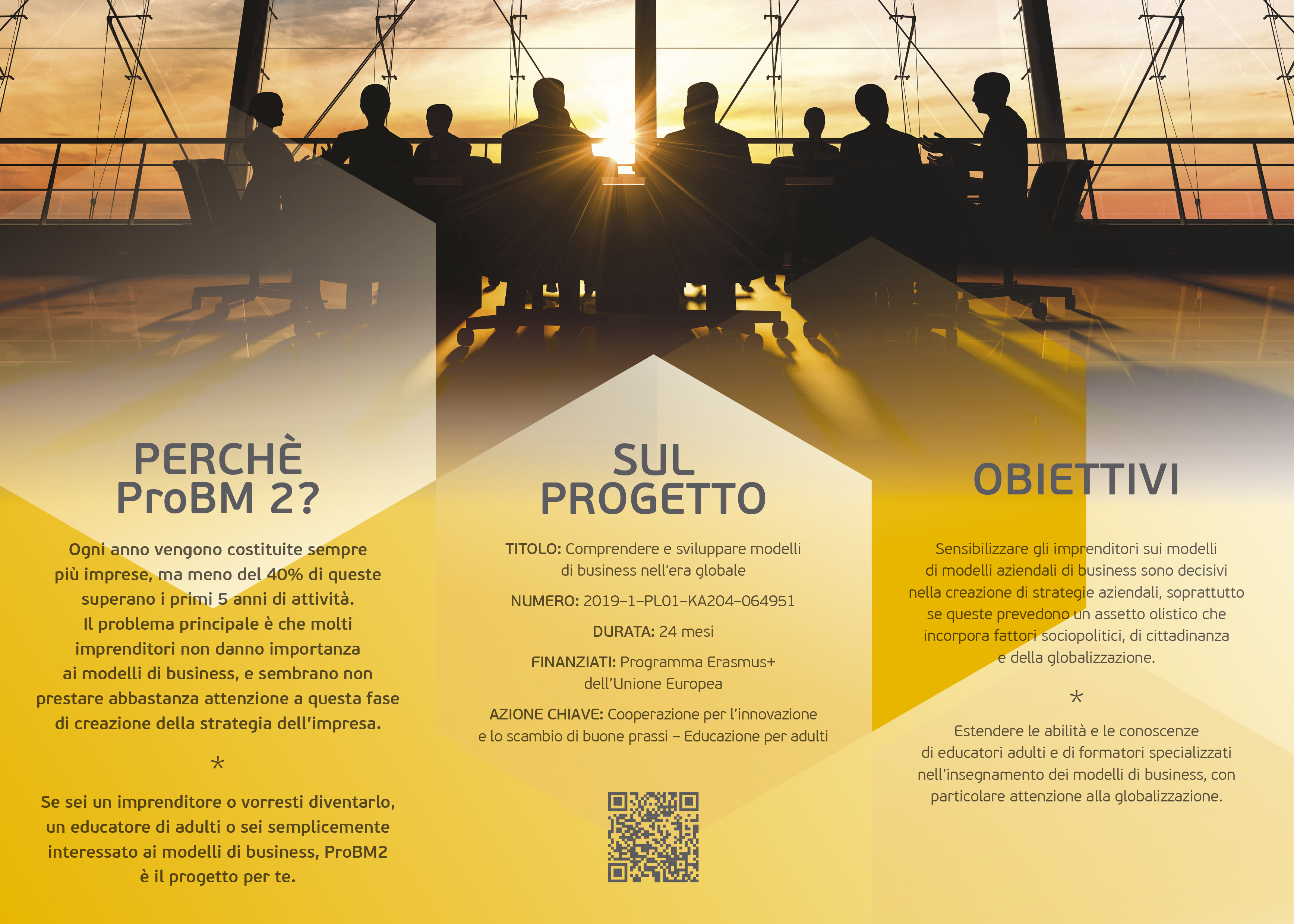Ogni anno vengono fondate sempre più imprese, ma meno del 40% di queste superano i primi 5 anni di attività. Il problema principale è che molti imprenditori non danno importanza ai modelli di business, e sembrano non prestare abbastanza attenzione a questa fase di creazione dell’impresa. Se sei un imprenditore o vorresti diventarlo, un educatore adulto o sei semplicementi interessato ai modelli aziendali di business, ProBM2 è il progetto che fa per te. |