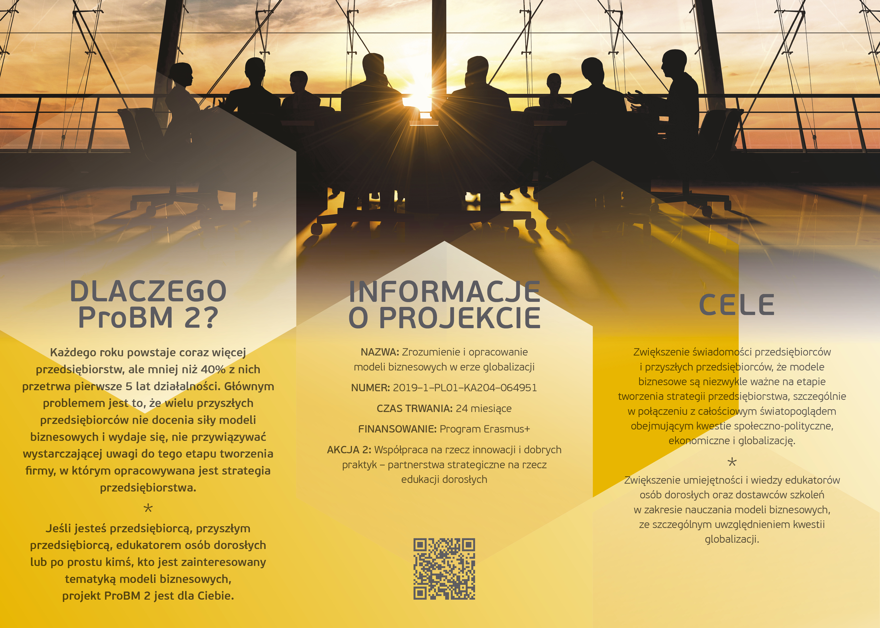 Każdego roku powstaje coraz więcej przedsiębiorstw, jednak mniej niż 40% z nich jest w stanie przetrwać pierwsze pięć lat działalności. Główny problem jest fakt, że wielu przyszłych przedsiębiorców nie docenia siły modeli biznesowych i nie przywiązuje wystarczającej uwagi do tego etapu tworzenia firmy. Jeśli jesteś przedsiębiorcą, przyszłym przedsiębiorcą, edukatorem dorosłych lub po prostu osobą zainteresowaną tematem modeli biznesowych, projekt ProBM 2 jest dla Ciebie. |